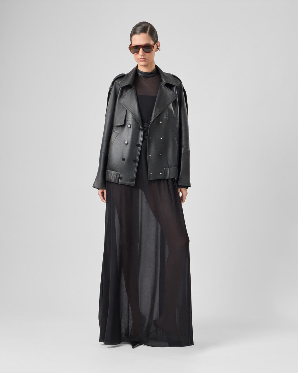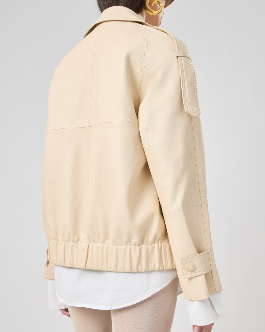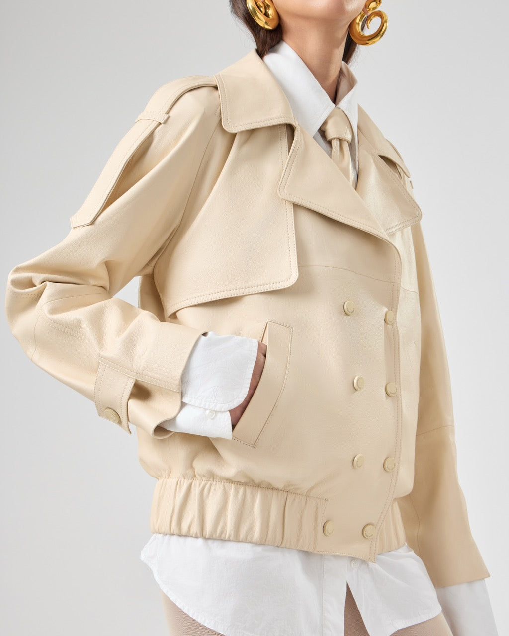 A Jaqueta Bomber Coat Helena tem modelagem ampla com fechamento frontal transpassado, adornado por botões de pressão, e destaca-se por detalhes como lapelas largas, martingales nos ombros e punhos com ajuste por botão. O acabamento posterior inclui uma pala horizontal e uma barra com elástico franzido, garantindo o volume característico do modelo.