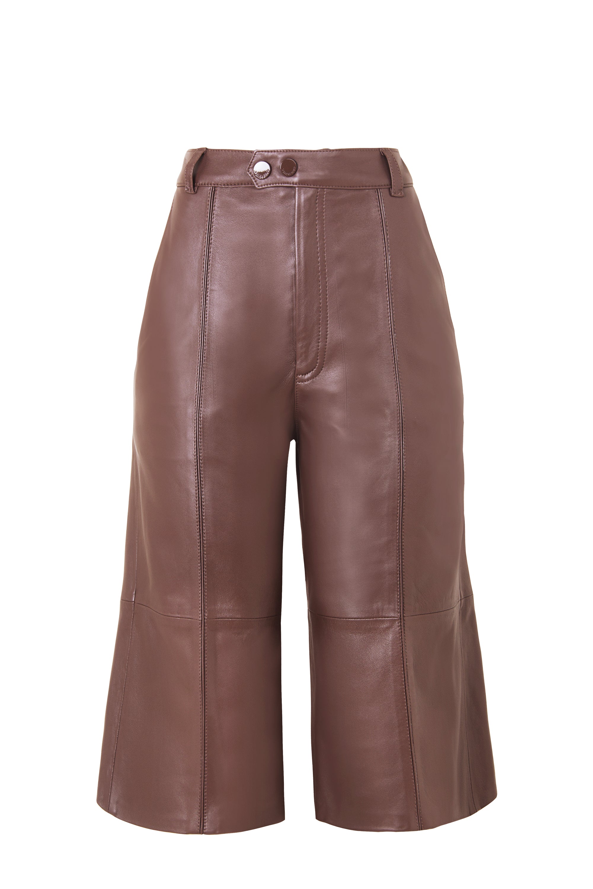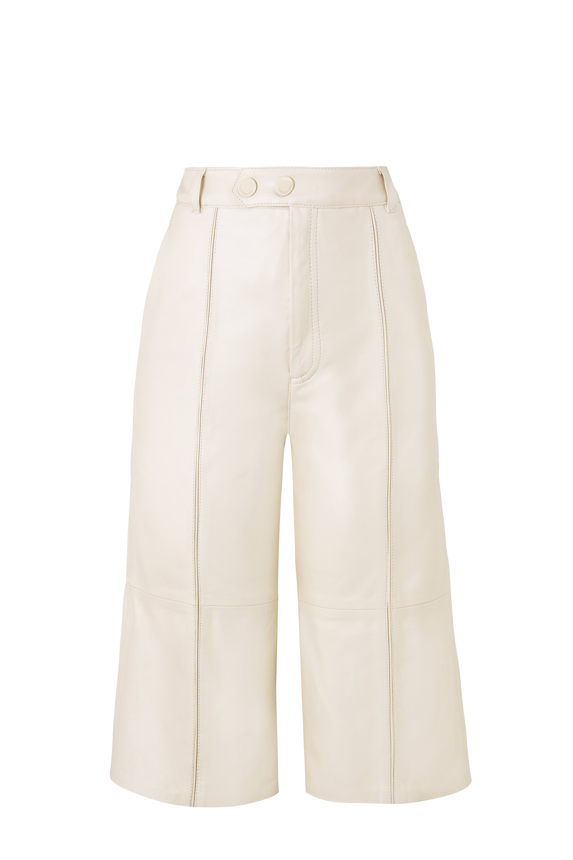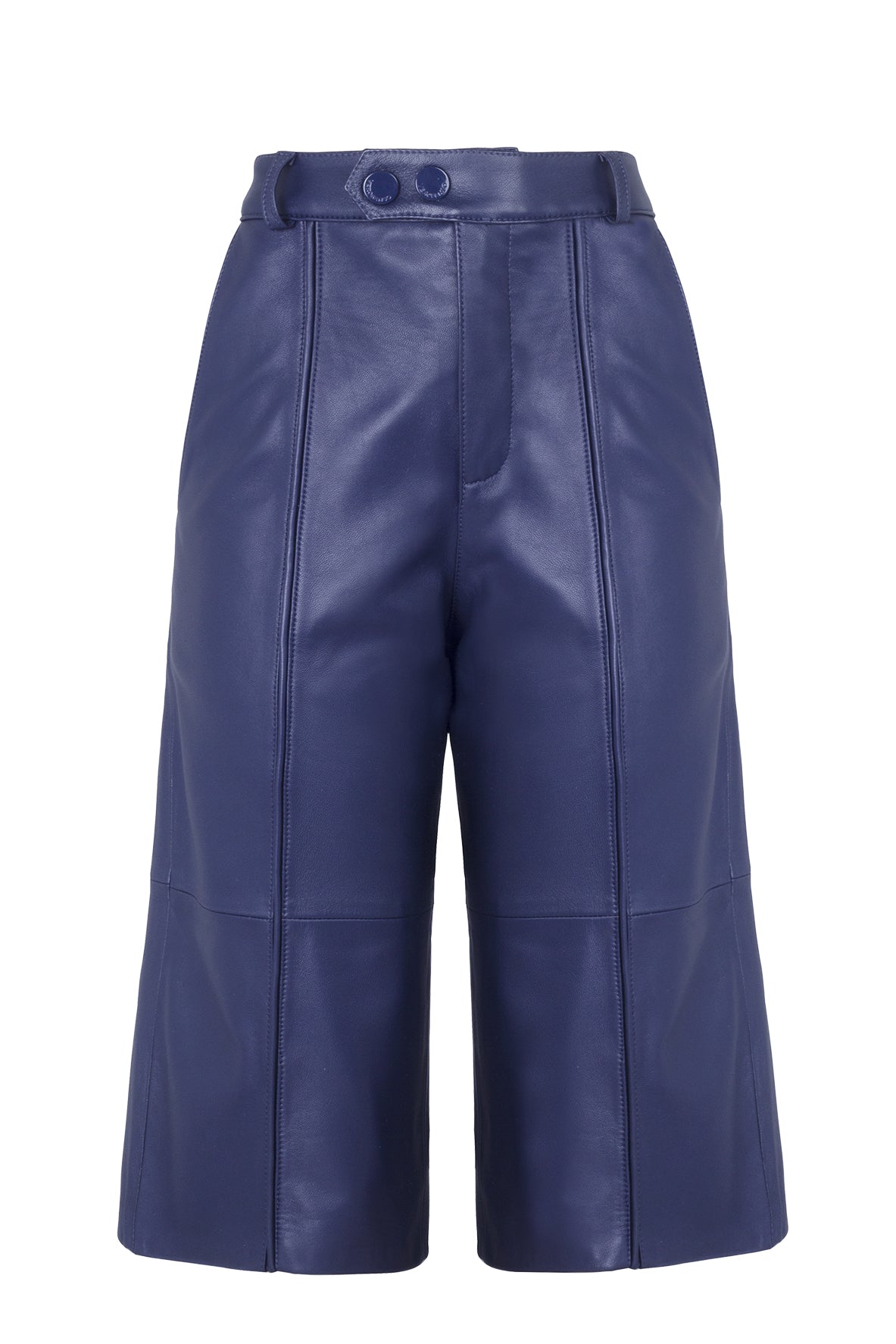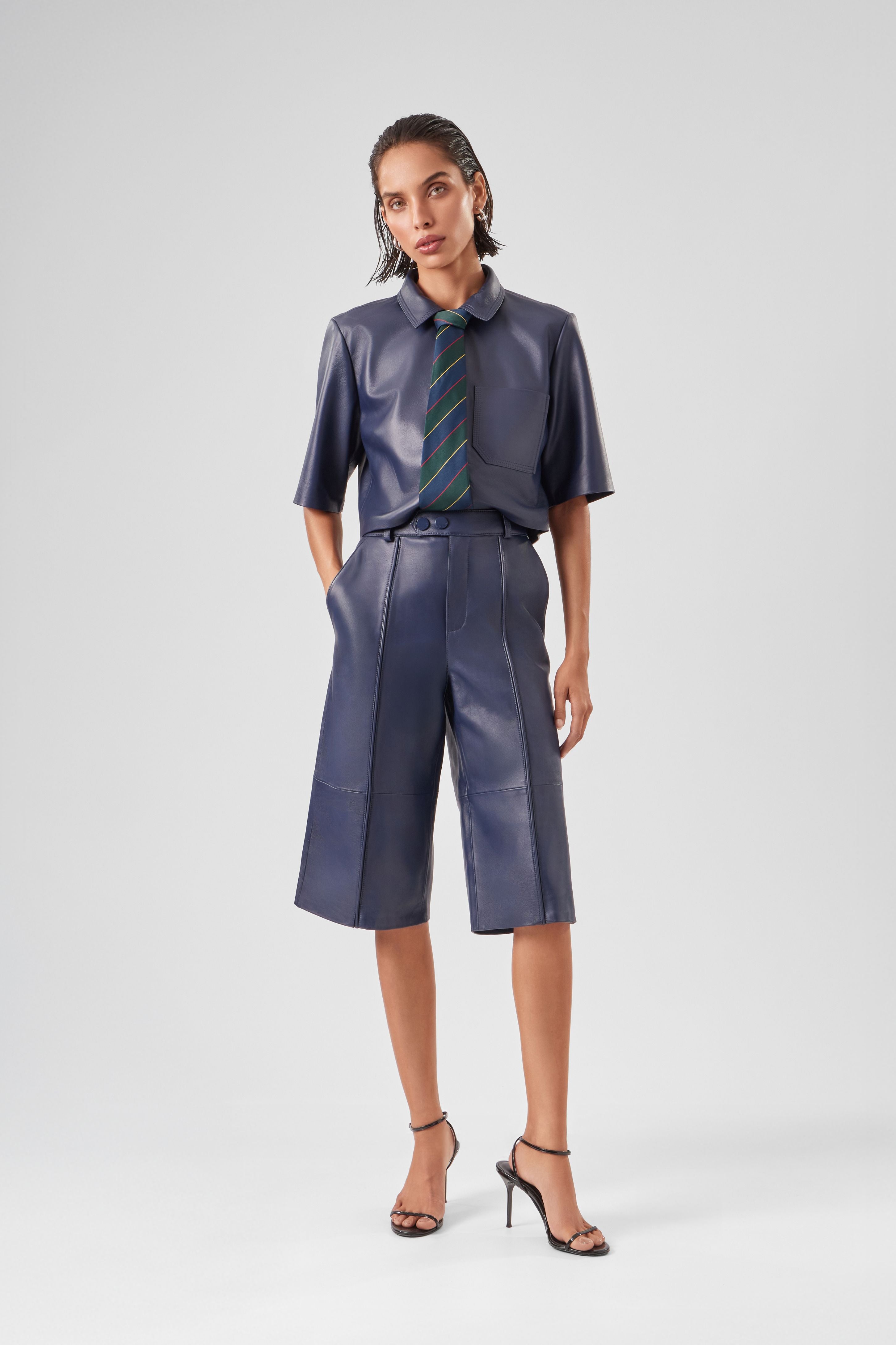 A Bermuda Colors tem comprimento alongado, cintura alta, shape reto e recortes verticais. Possui passantes, fechamento frontal com zíper e dois botões, além de bolsos frontais e bolsos em vivo falsos nas costas.