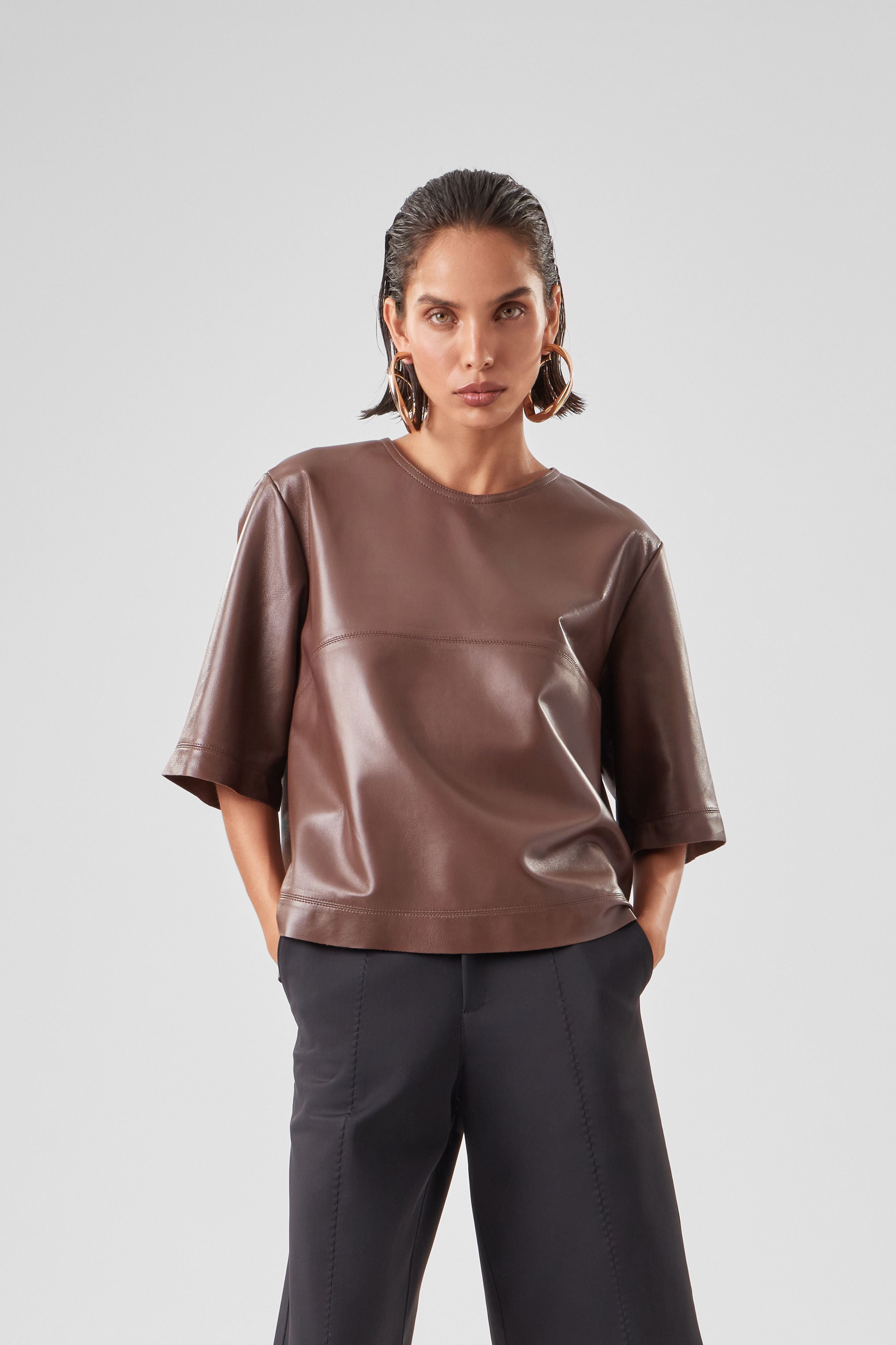 A Blusa Ampla Off-Screen combina shape amplo com comprimento alongado. Com fechamento por botão de pressão na parte de trás da gola.