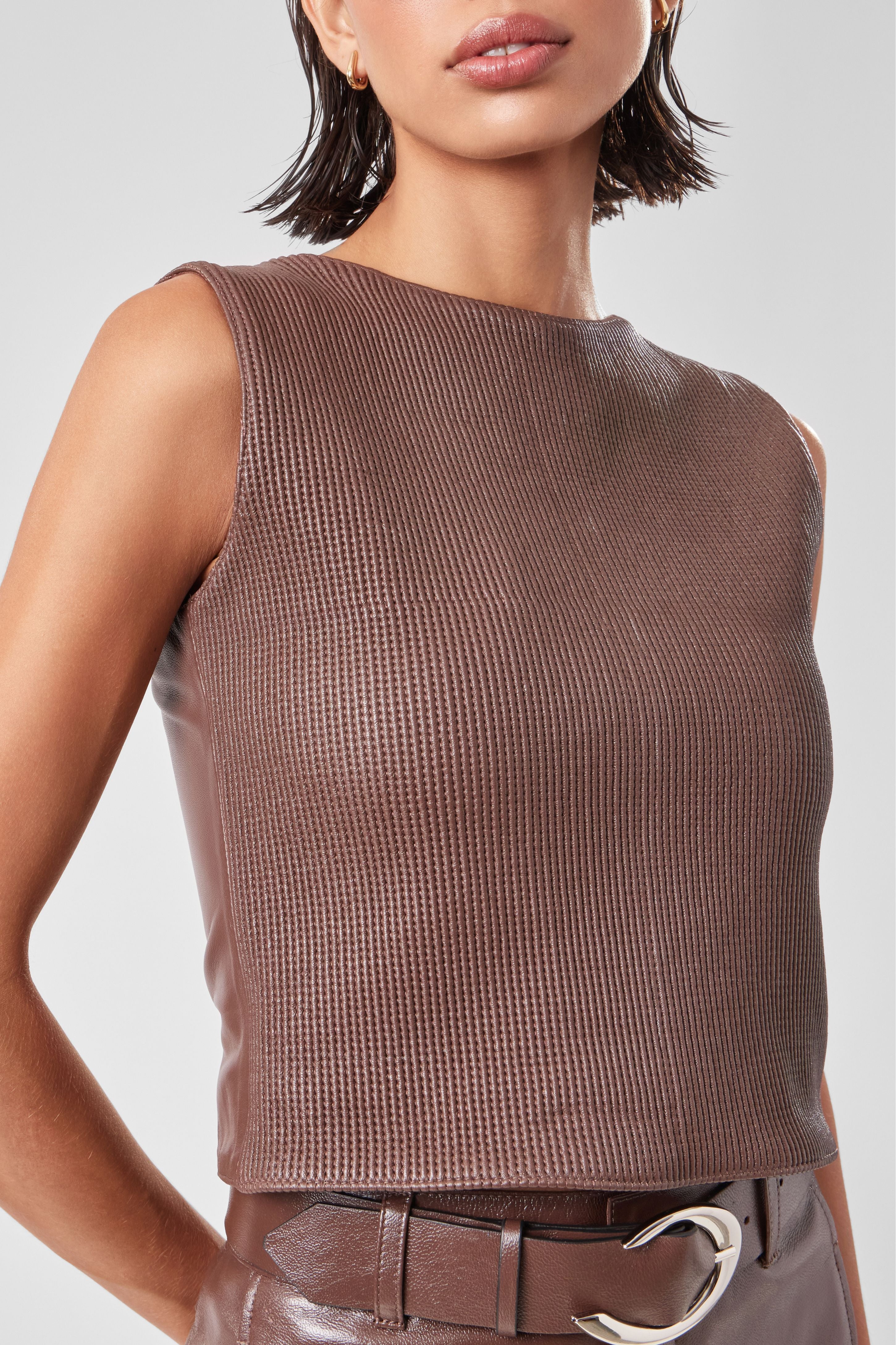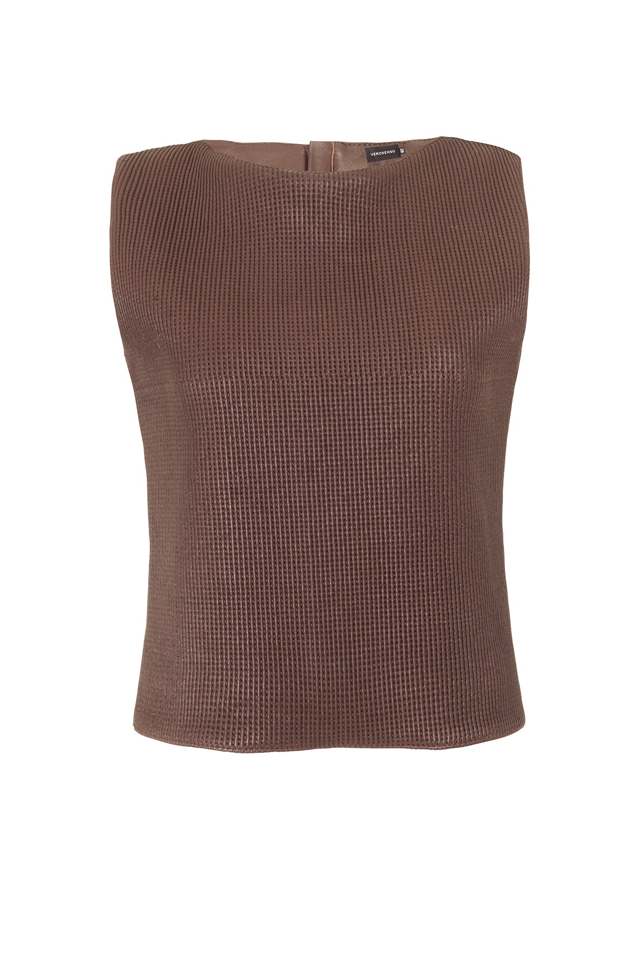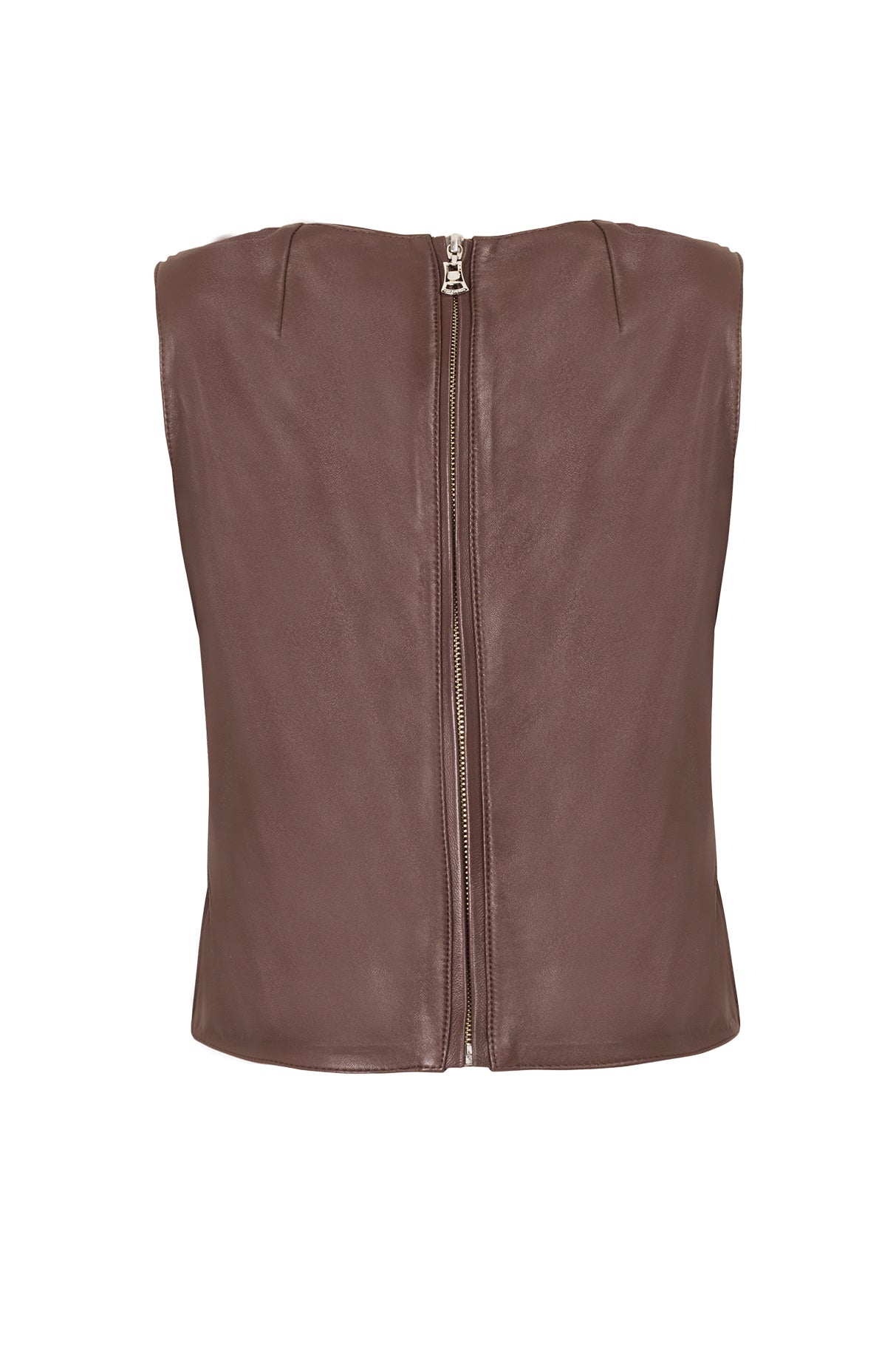 A Blusa Look Closer tem a sua parte frontal produzida em couro bordado, criando uma textura única. As costas são em couro liso com fechamento por zíper de metal. O modelo possui shape justo, gola canoa e comprimento curto.