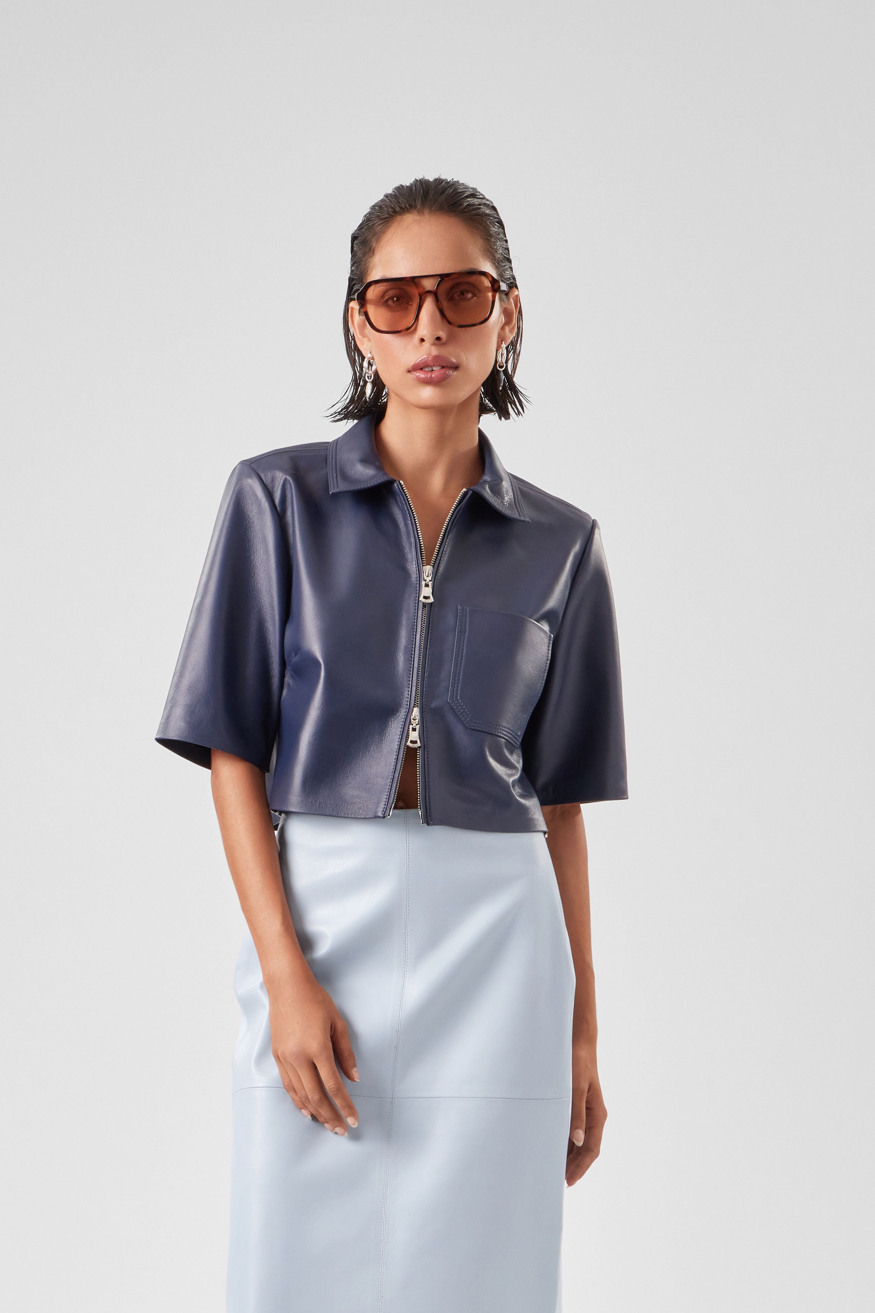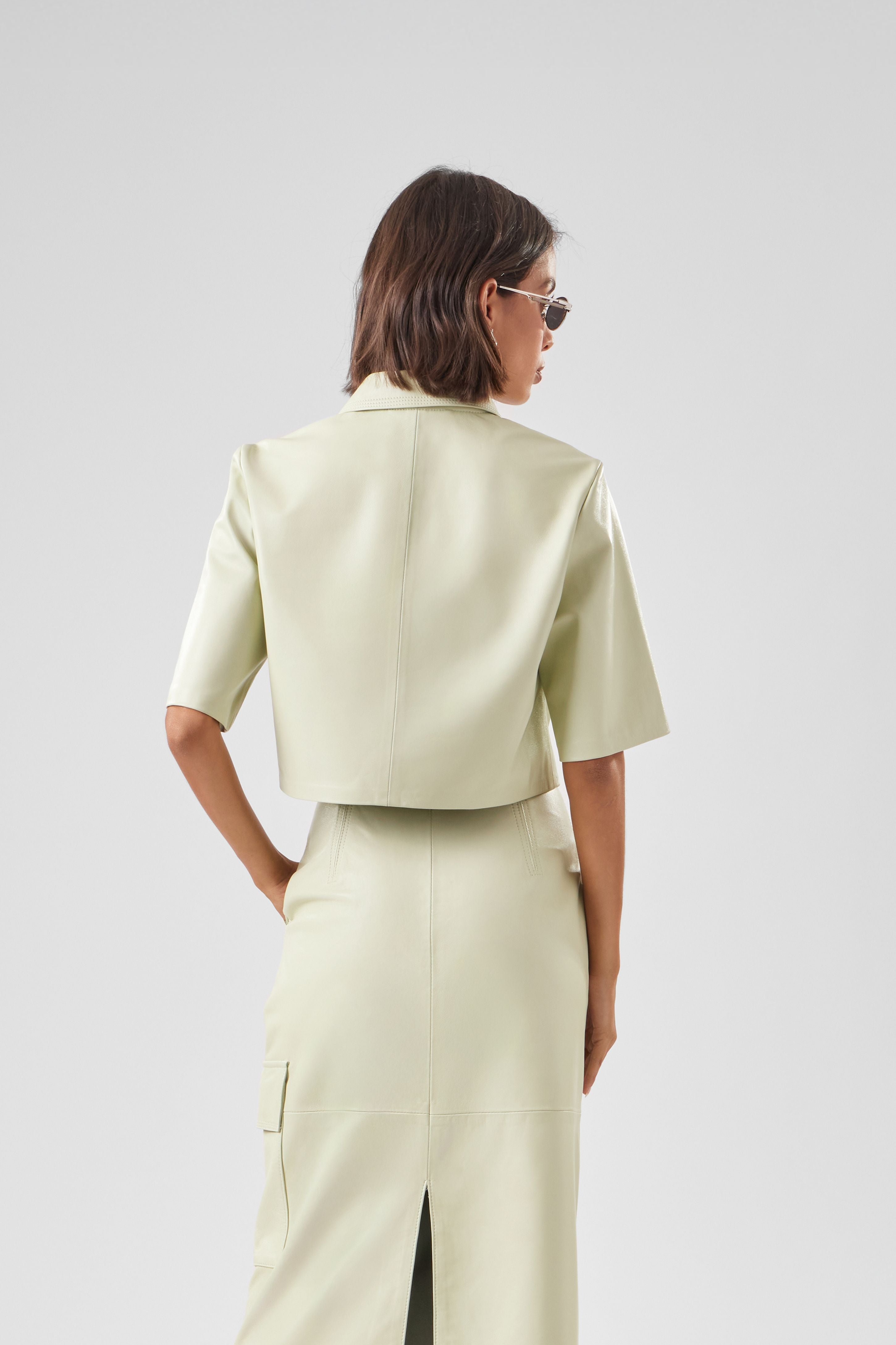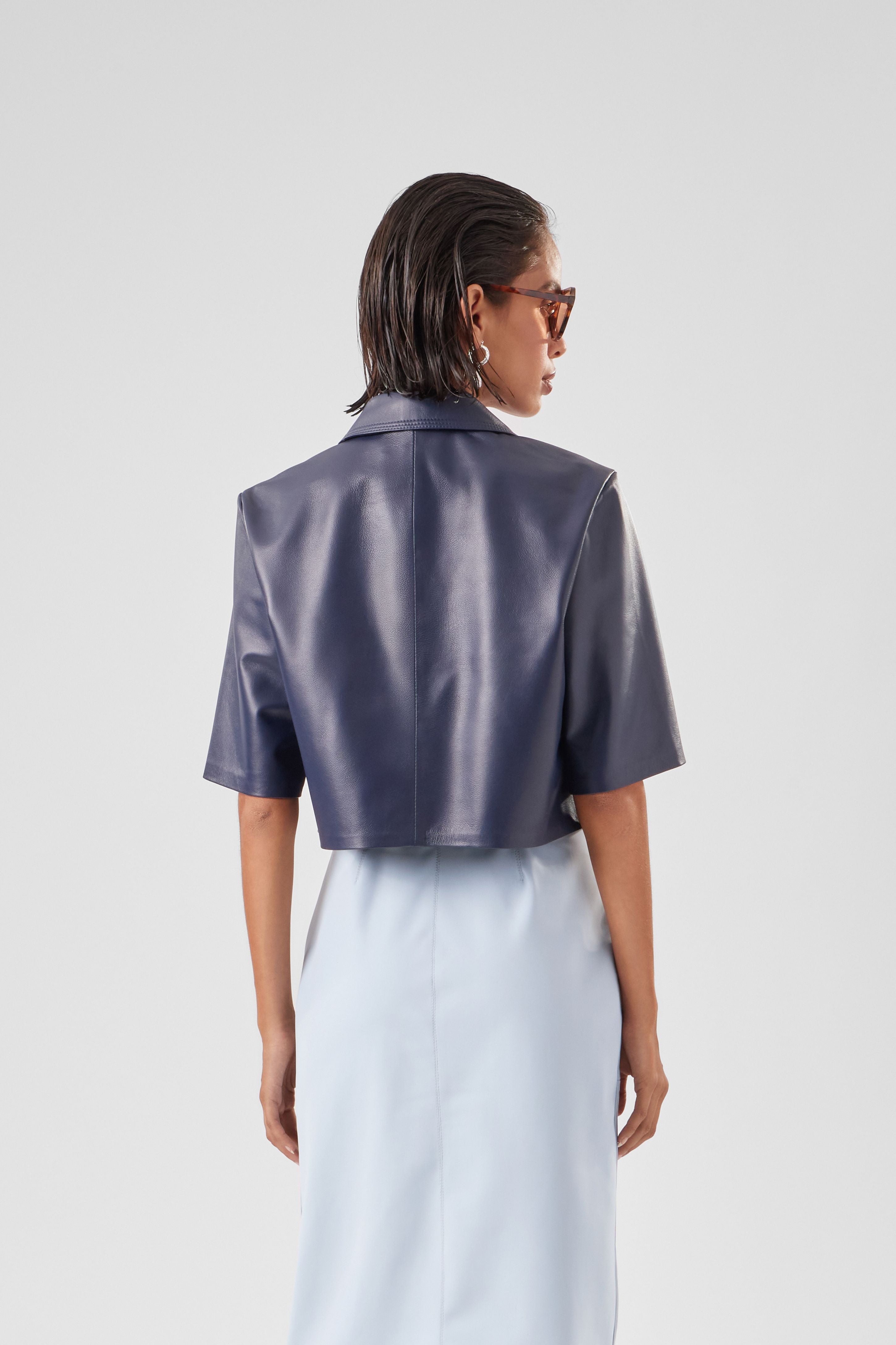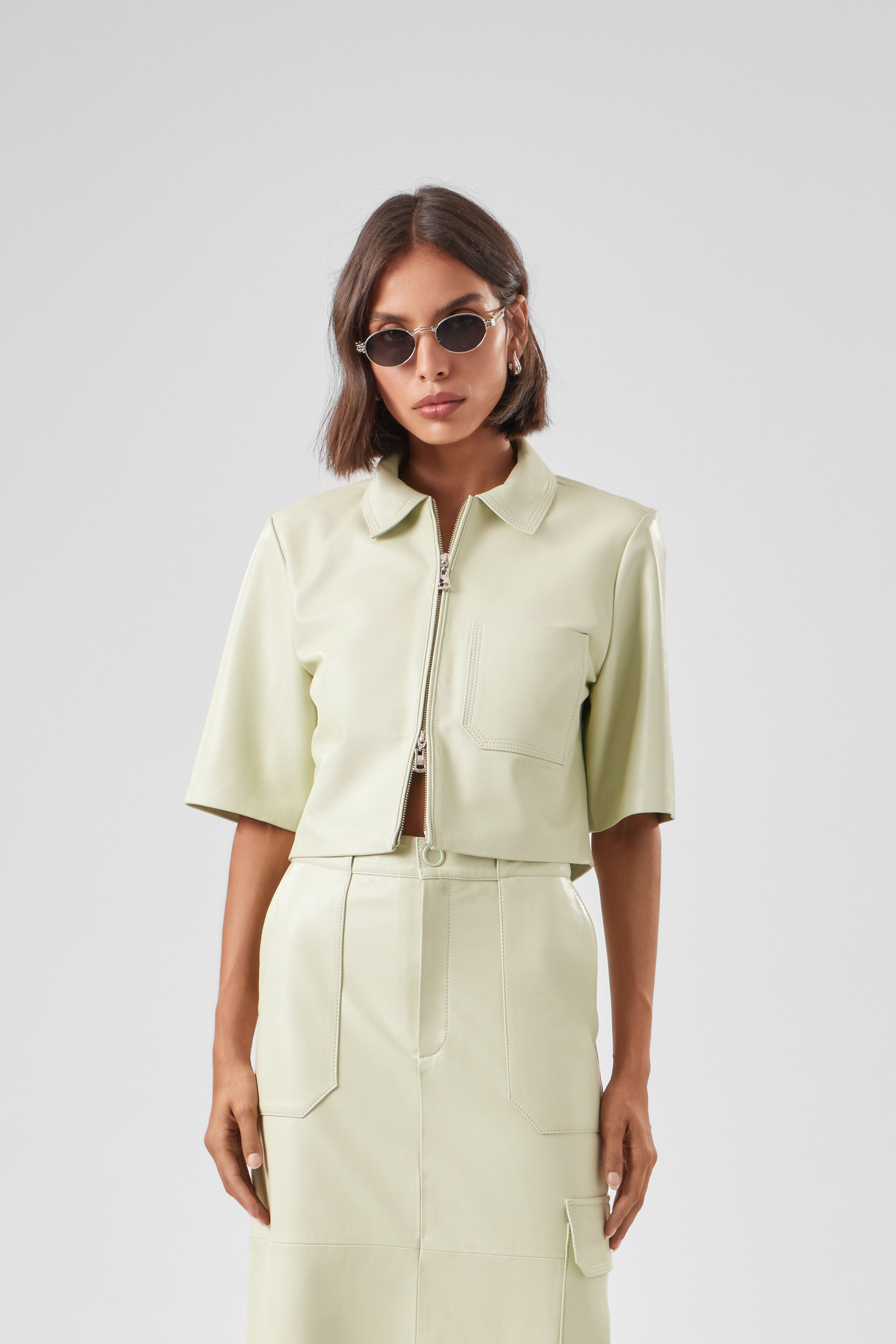 A Camisa Colors possui comprimento cropped e shape reto com gola simples. O fechamento em zíper frontal de dois cursores embutido oferece praticidade, enquanto o bolso lateral funcional completa a peça com um detalhe utilitário