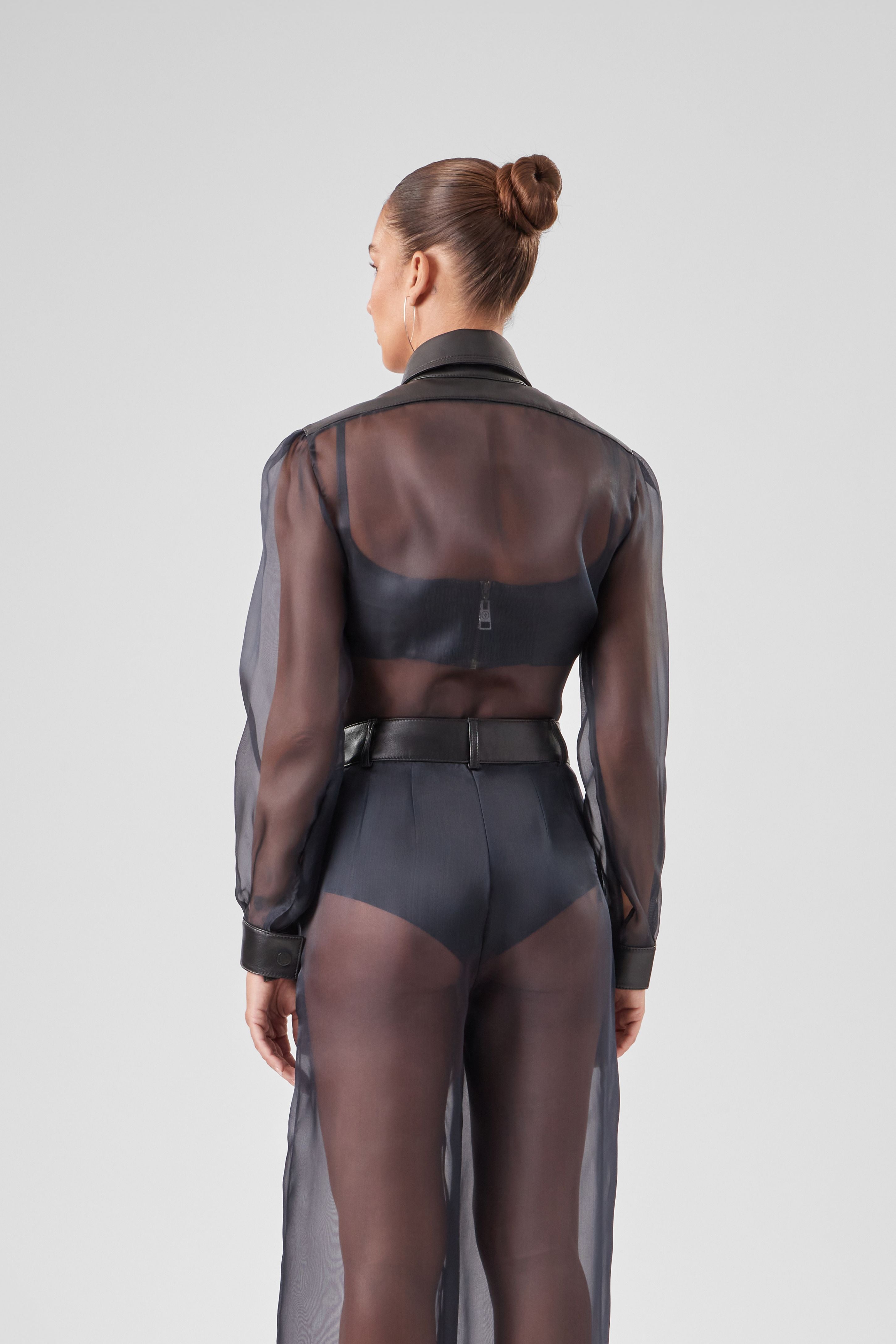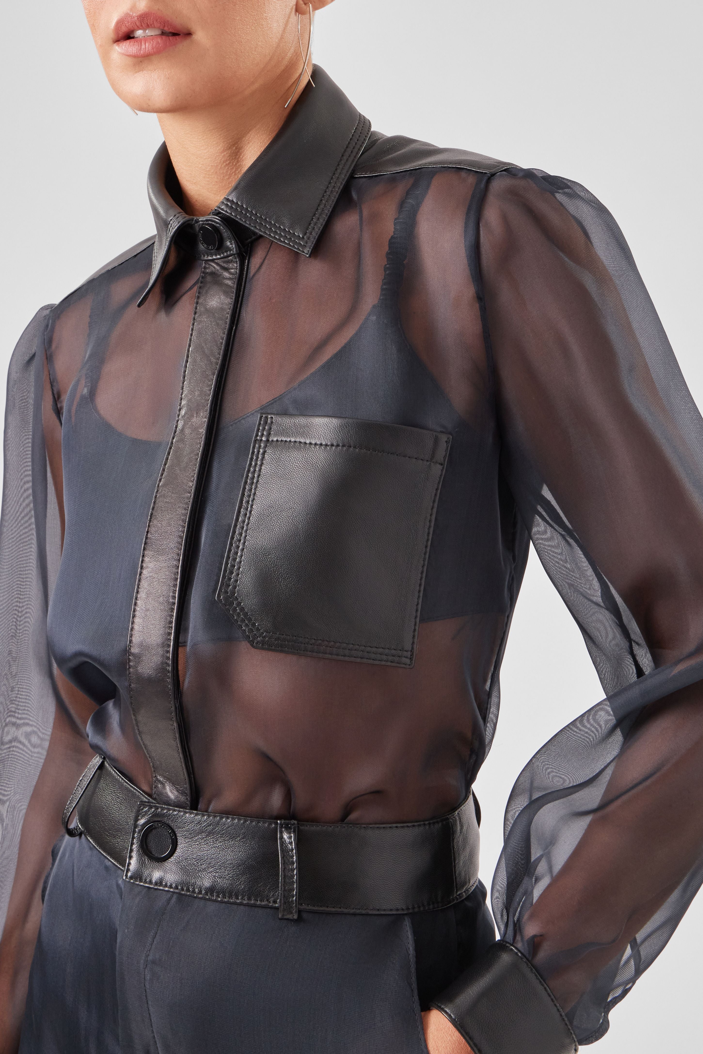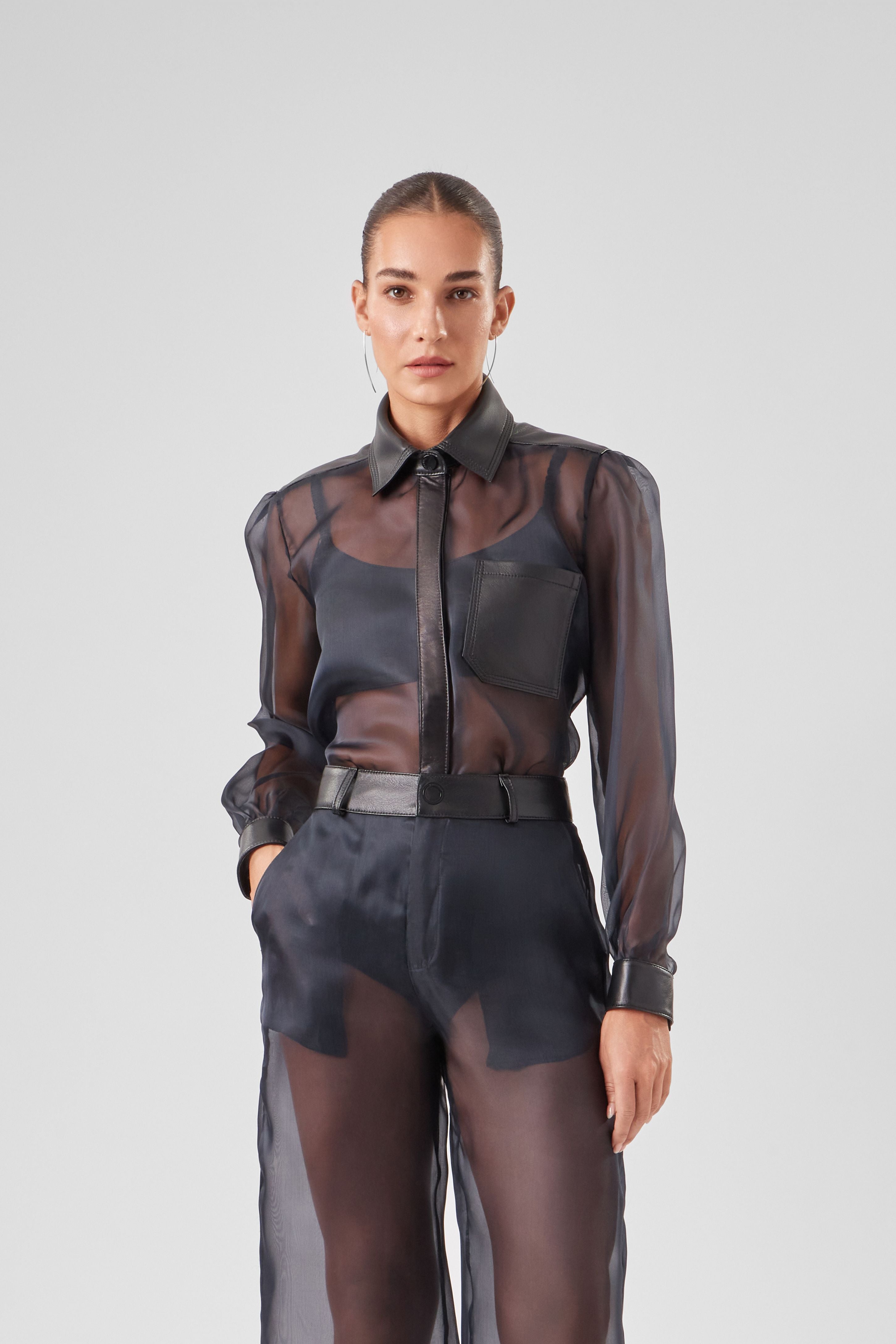 A Camisa Mix Seda é confeccionada em organza, com detalhes em couro na gola, punhos, carcela e bolso. Possui shape levemente amplo e fechamento por botões frontais e nos punhos.