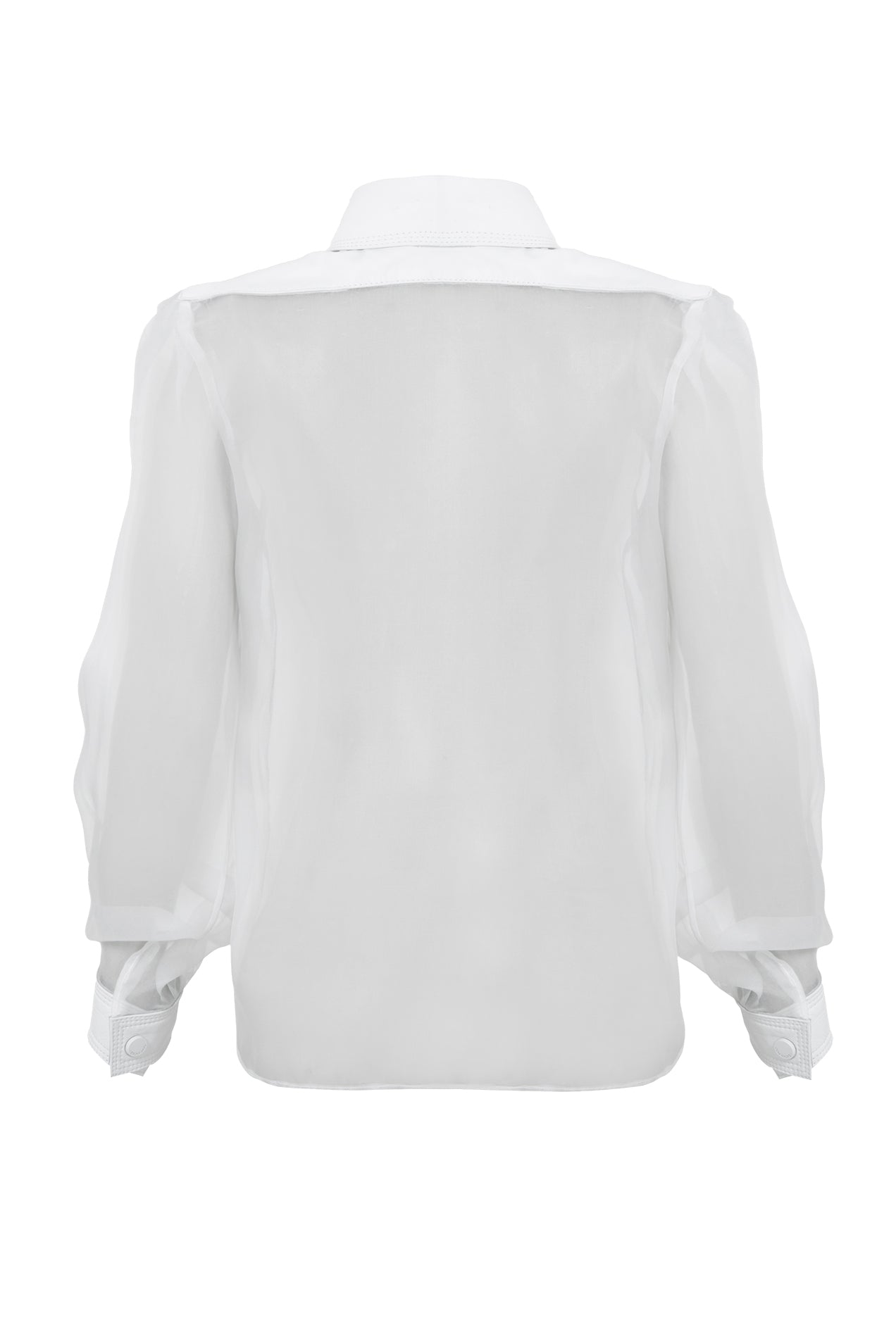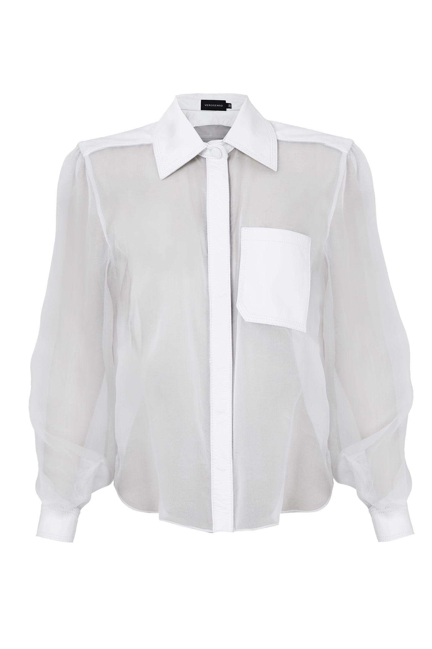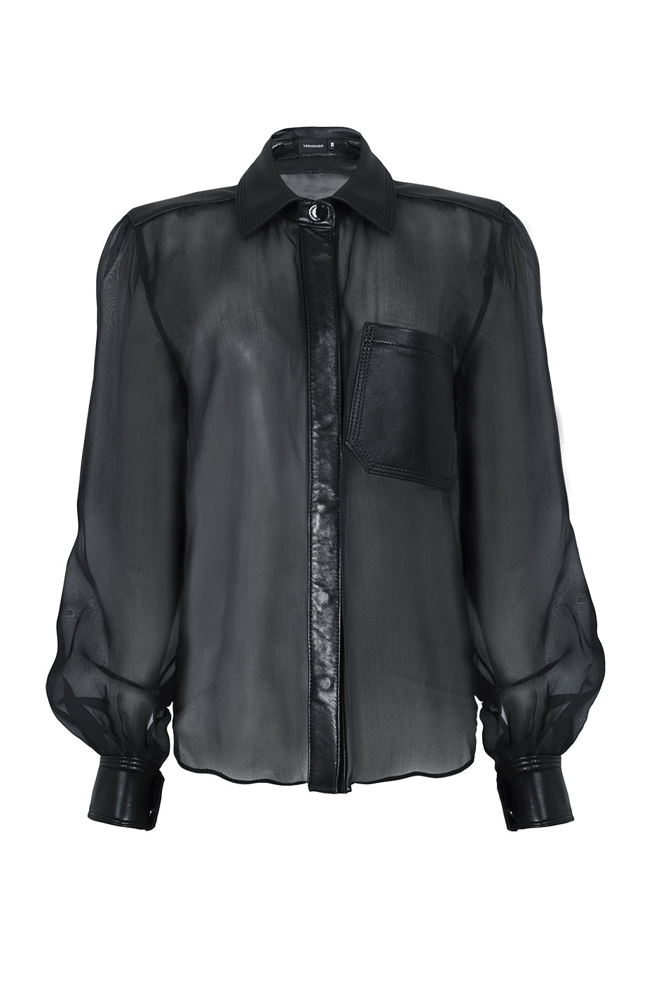A Camisa Mix Seda é confeccionada em organza, com detalhes em couro na gola, punhos, carcela e bolso. Possui shape levemente amplo e fechamento por botões frontais e nos punhos.