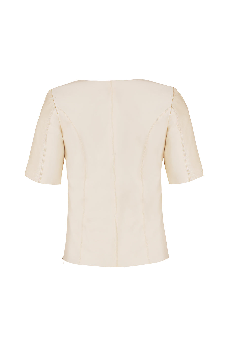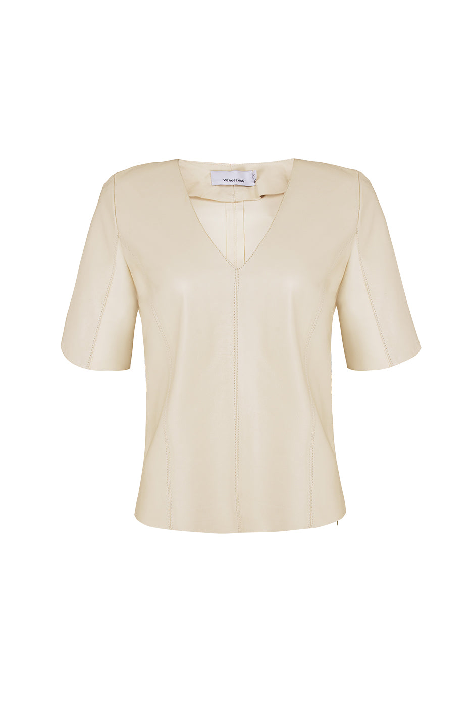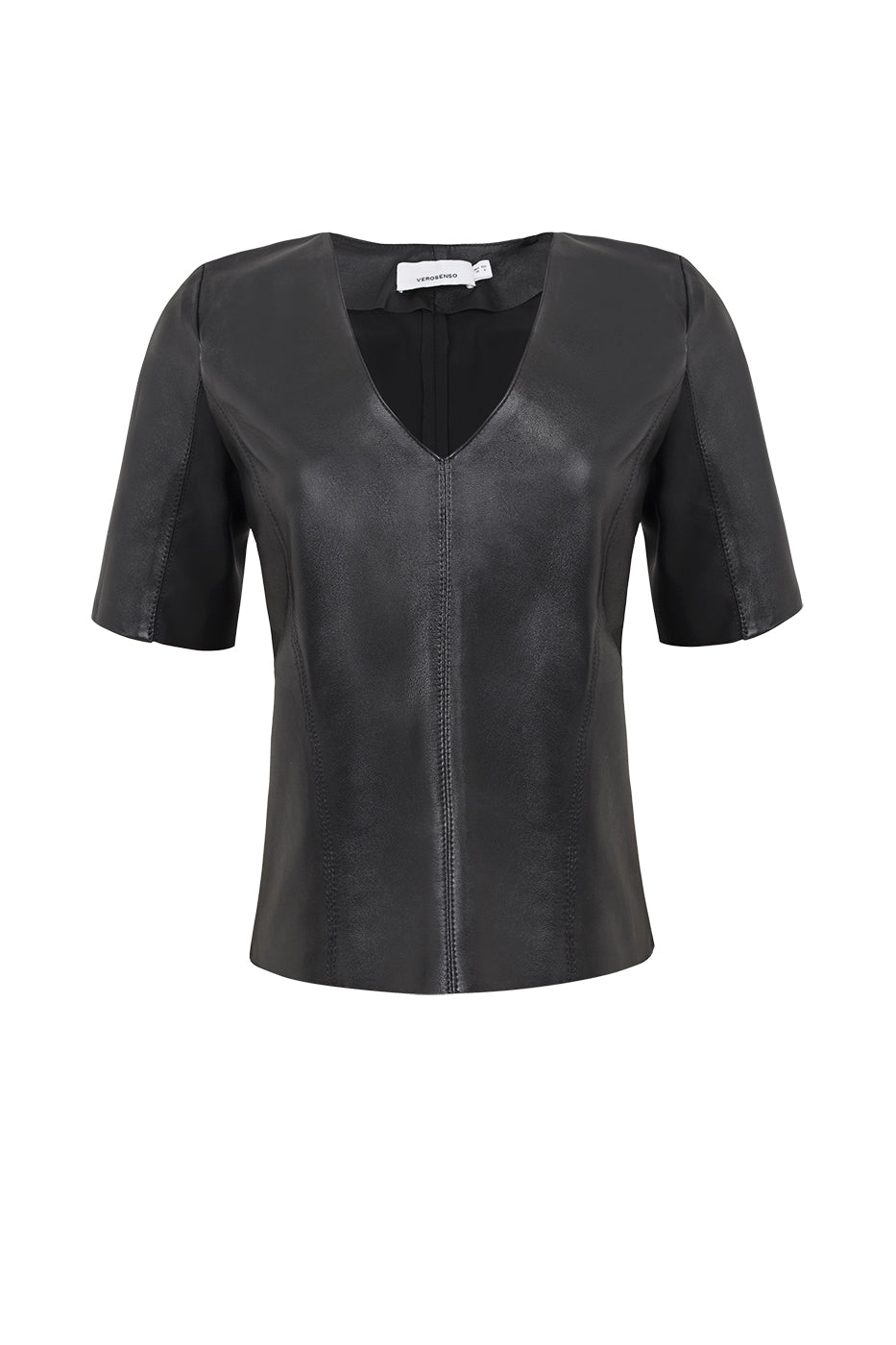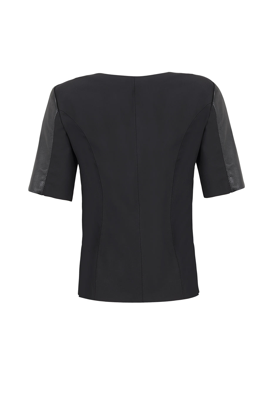 A Blusa Decote V Mix Malha Renata da Verosenso é confeccionada em shape levemente ajustado, manga curta, gola V, detalhes em pesponto e com recortes verticais que alongam o tronco. Frente feita em couro e costas em malha.