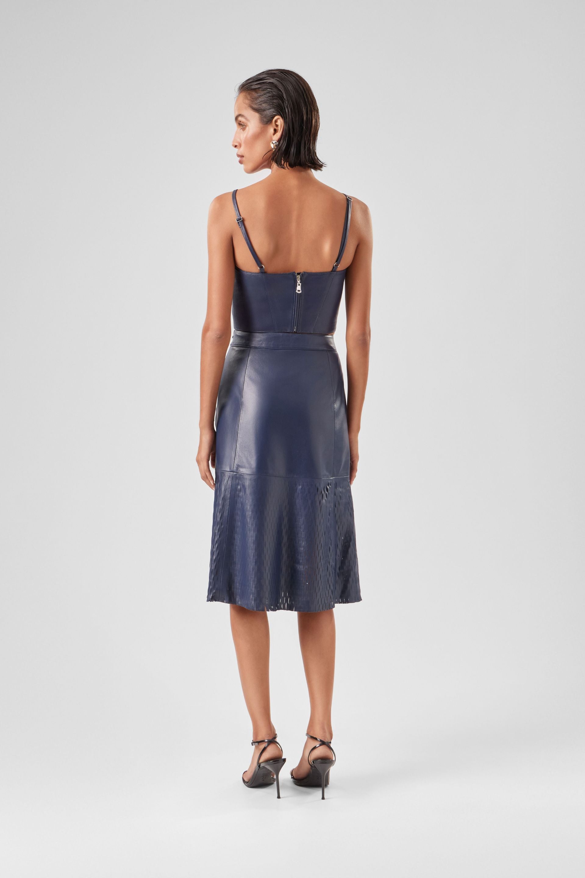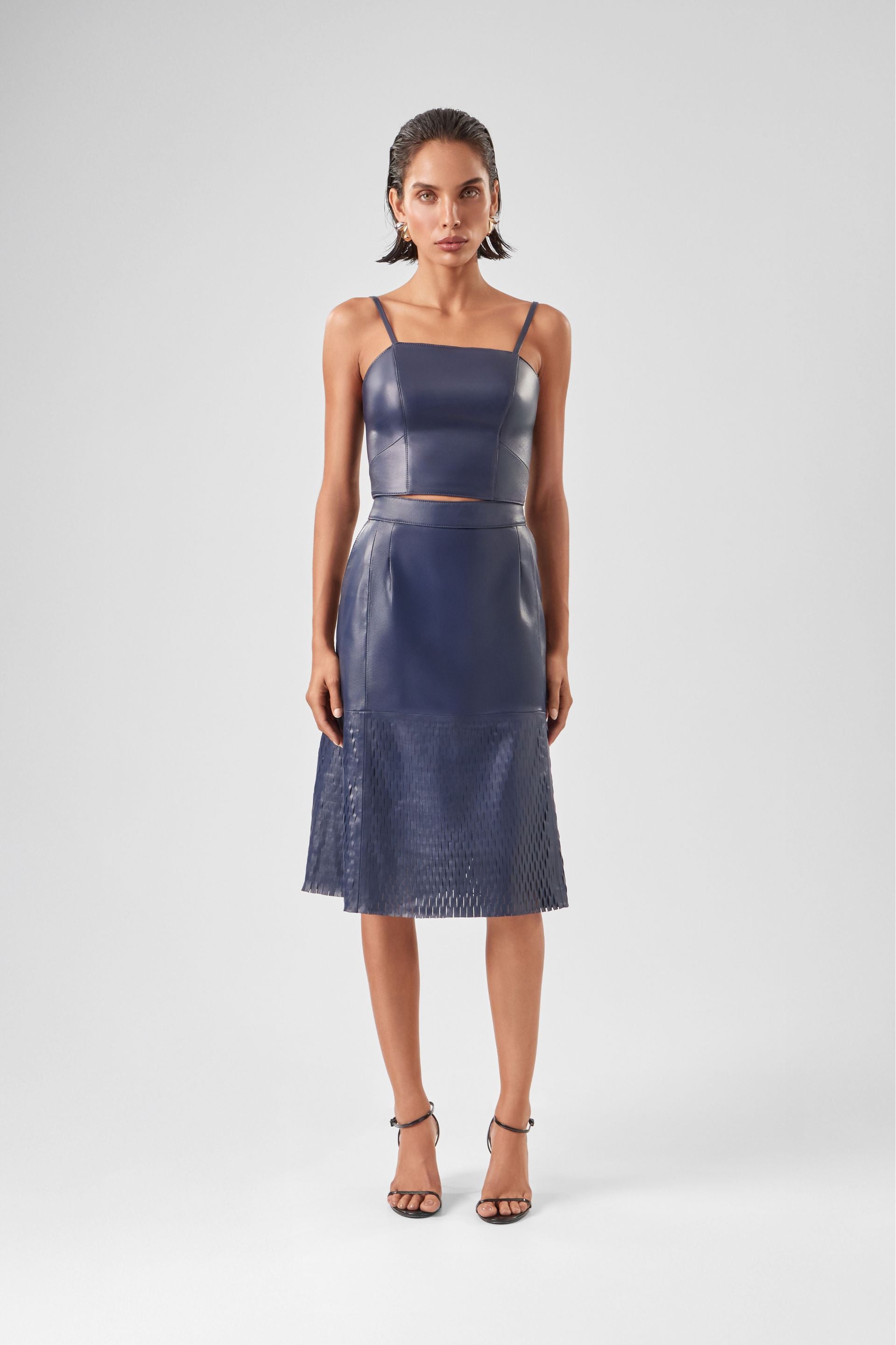 Com comprimento médio e cintura alta, a Saia Média Experimento apresenta shape evasê e bolsos frontais. Possui detalhe perfurado na barra, cós largo e fechamento lateral por zíper.