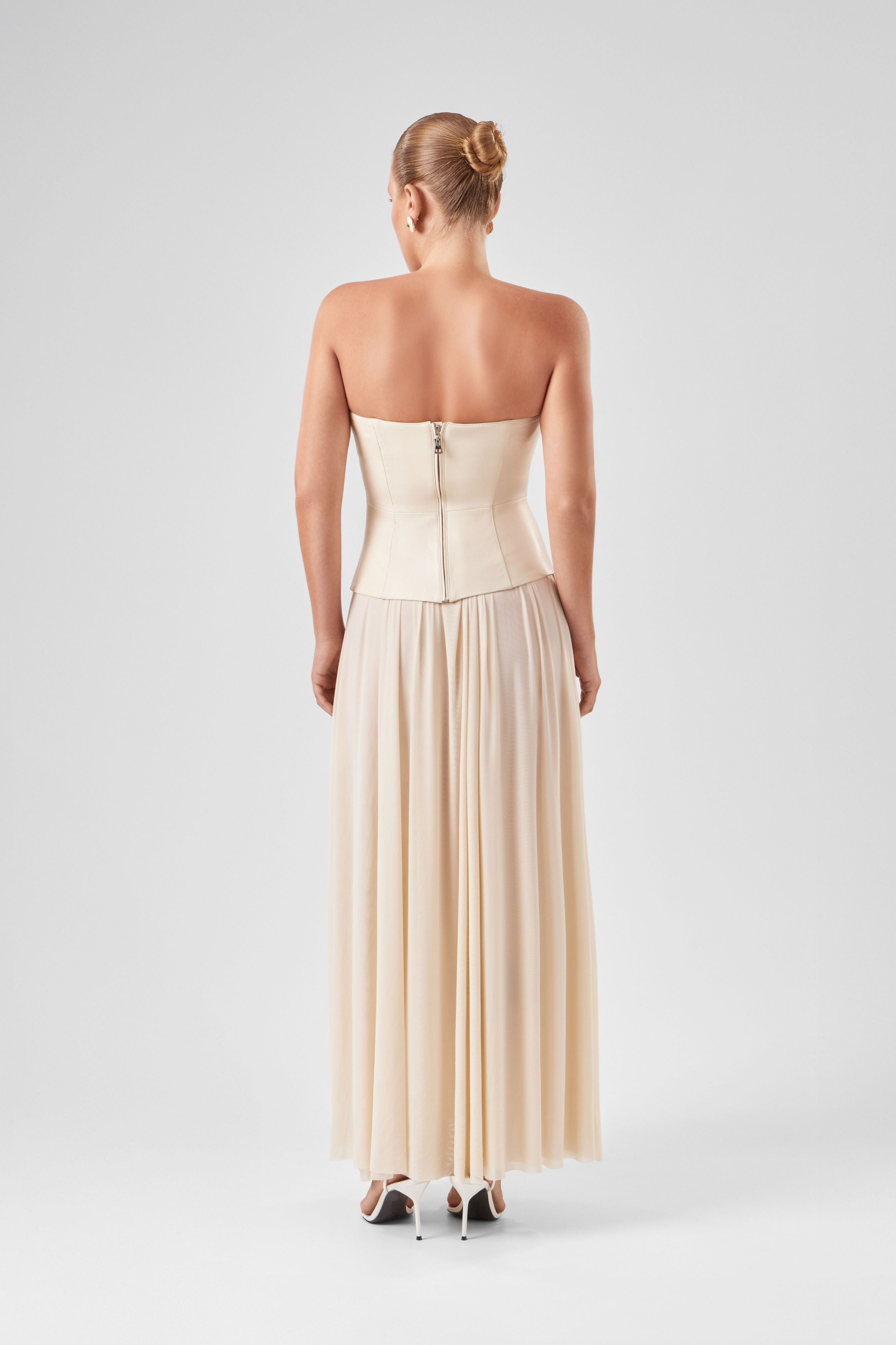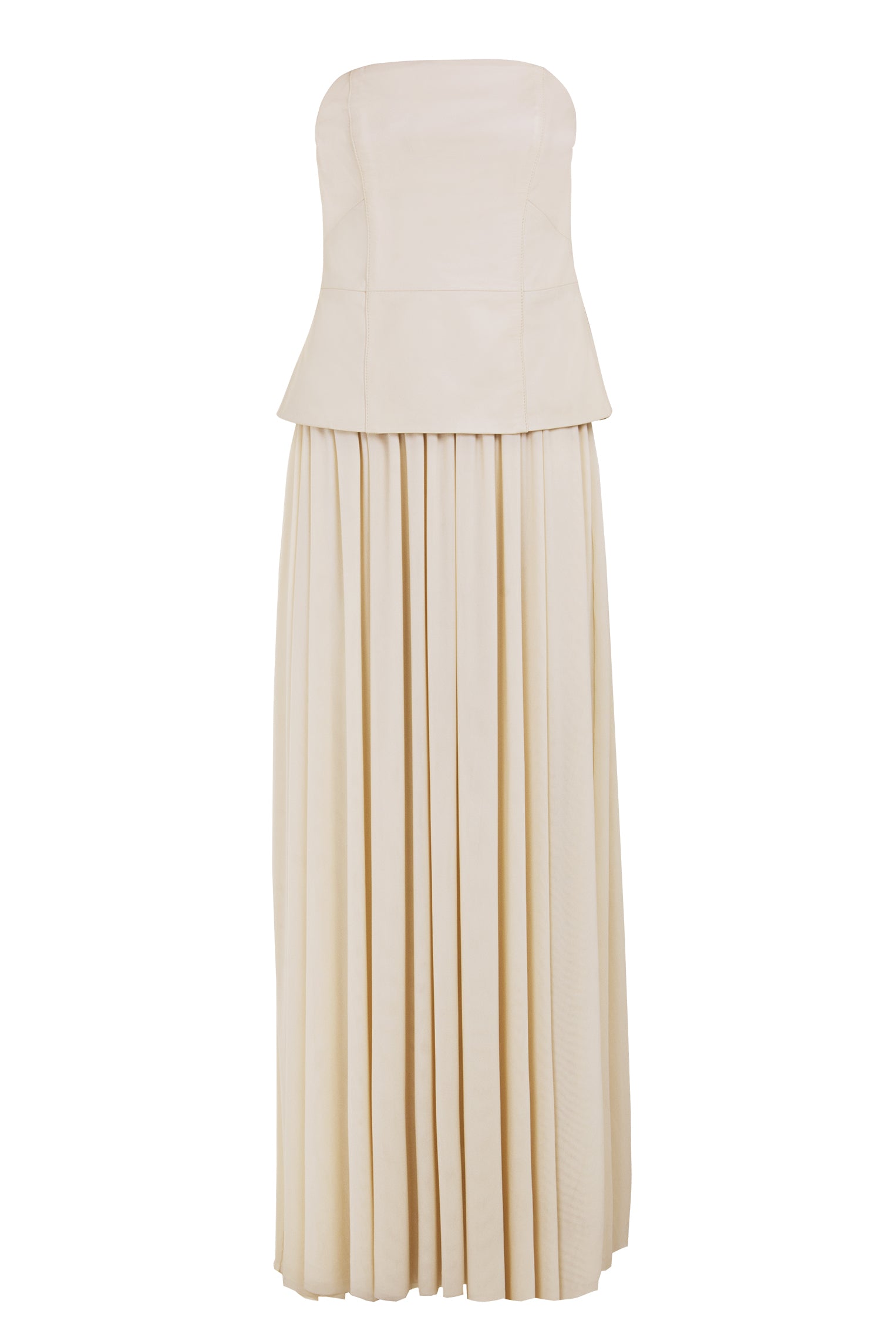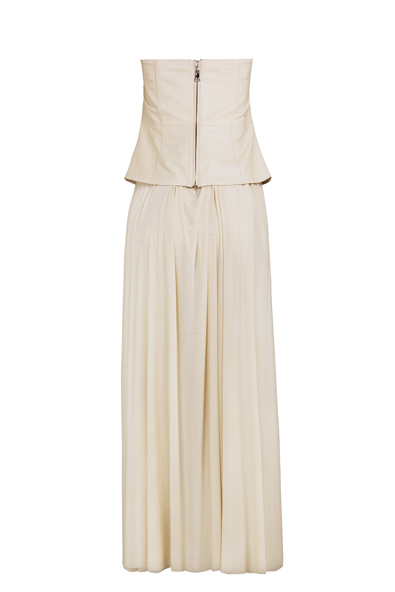 O Vestido Longo Mix Mesh combina o corpo em couro com saia evasê em tule. Apresenta decote tomara que caia, shape ajustado ao corpo, pences no busto e barbatanas laterais. Conta com alças removíveis em couro com reguladores, fechamento posterior por zíper invisível. *Cinto não acompanha a peça.