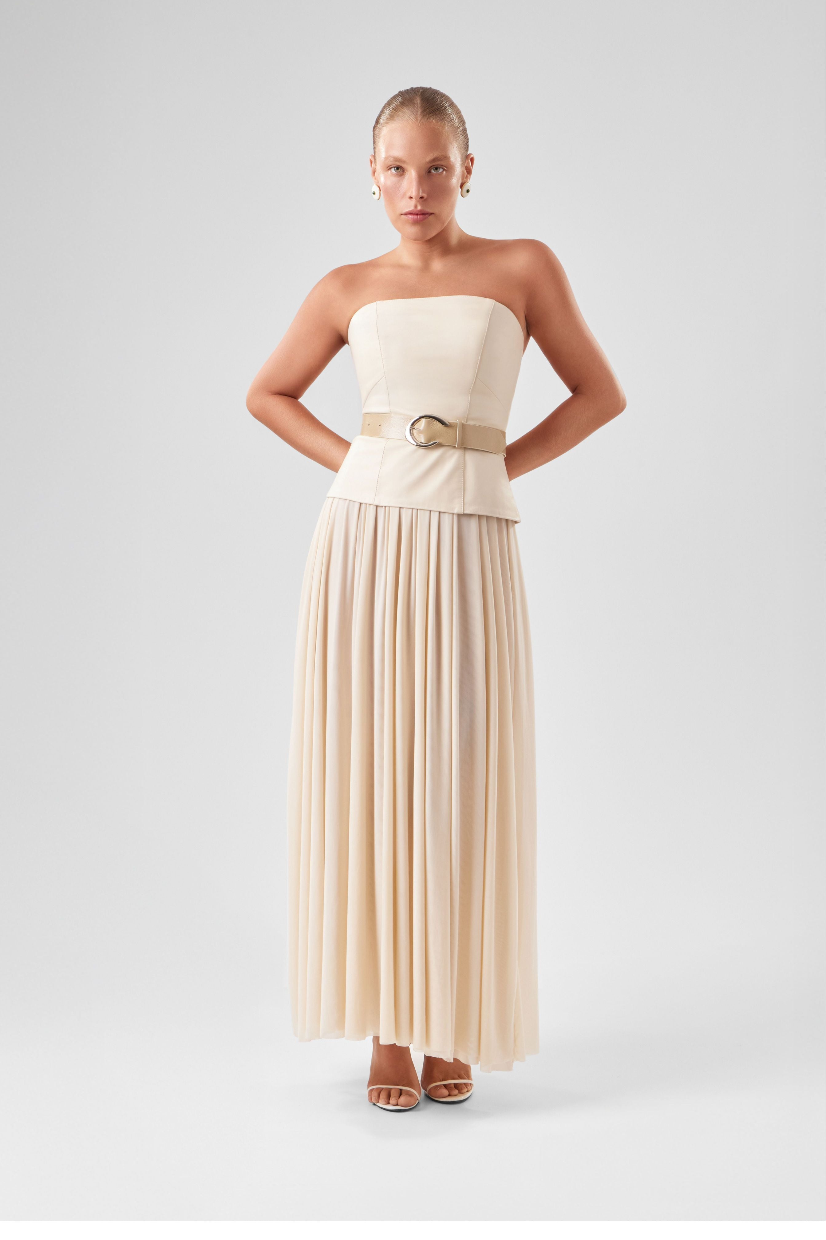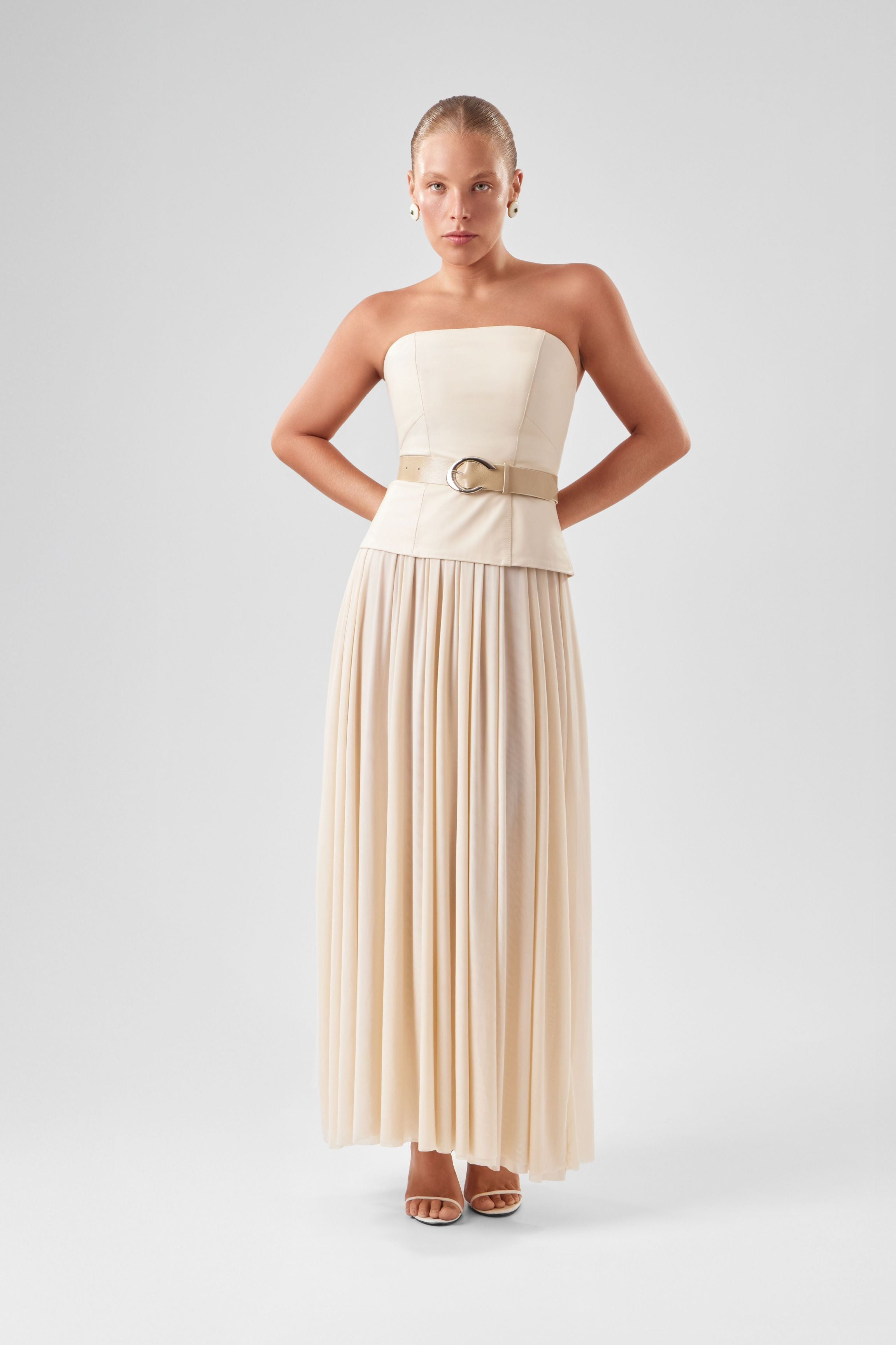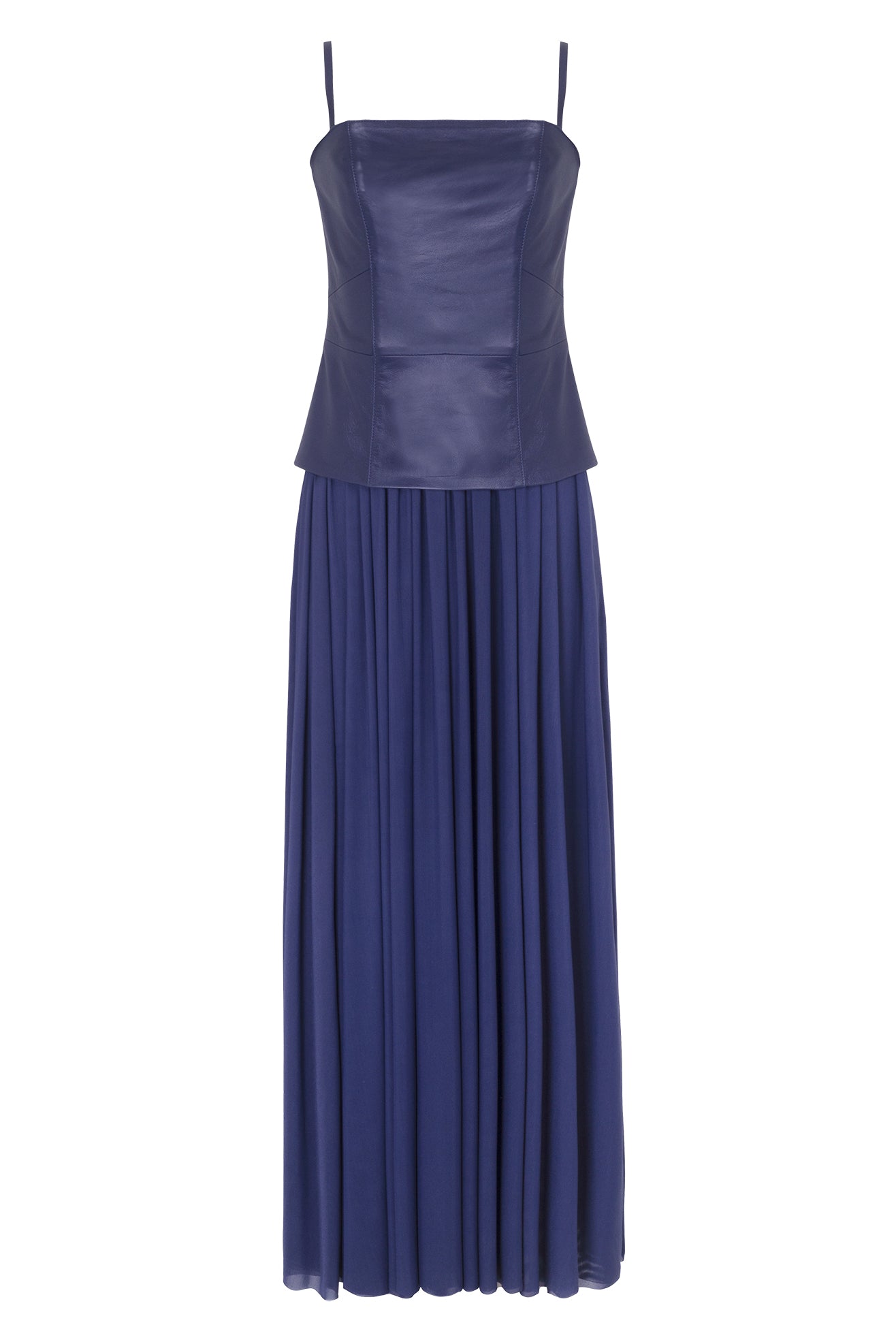 O Vestido Longo Mix Mesh combina o corpo em couro com saia evasê em tule. Apresenta decote tomara que caia, shape ajustado ao corpo, pences no busto e barbatanas laterais. Conta com alças removíveis em couro com reguladores, fechamento posterior por zíper invisível. *Cinto não acompanha a peça.